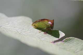 Grasshopper nymph, on a suspiciously autumnal-looking leaf. It's not autumn yet!