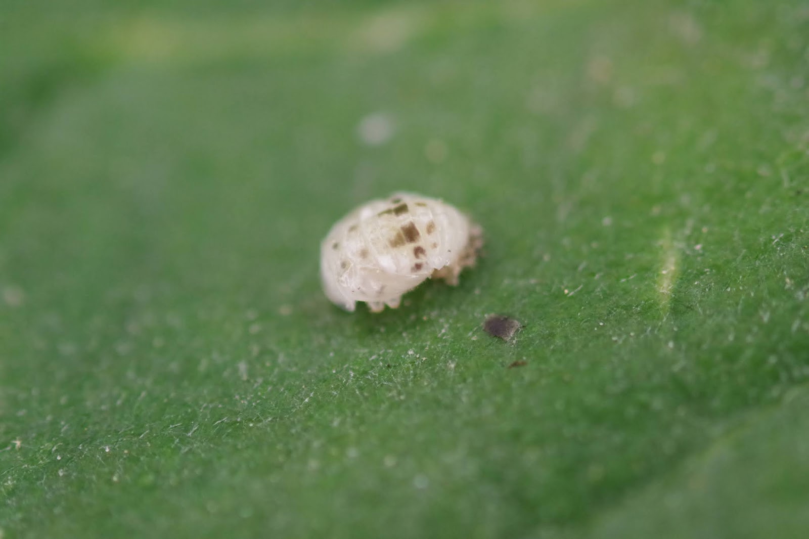 Hopper nymph on the leaf with all the tiny wasp chrysalides. Notice the holes in the chrysalides, where the wasps crawled out.