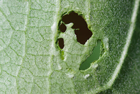 In my last post I showed a picture of a monarch butterfly egg. As I expected, the next day on my walk I found that it had hatched, and saw the tiny caterpillar. But it was raining, so I didn't have my camera. Then yesterday I wasn't able to venture into the woods to check on it. Today I found the leaf damage it had done in its first meals, but no caterpillar. Sigh...