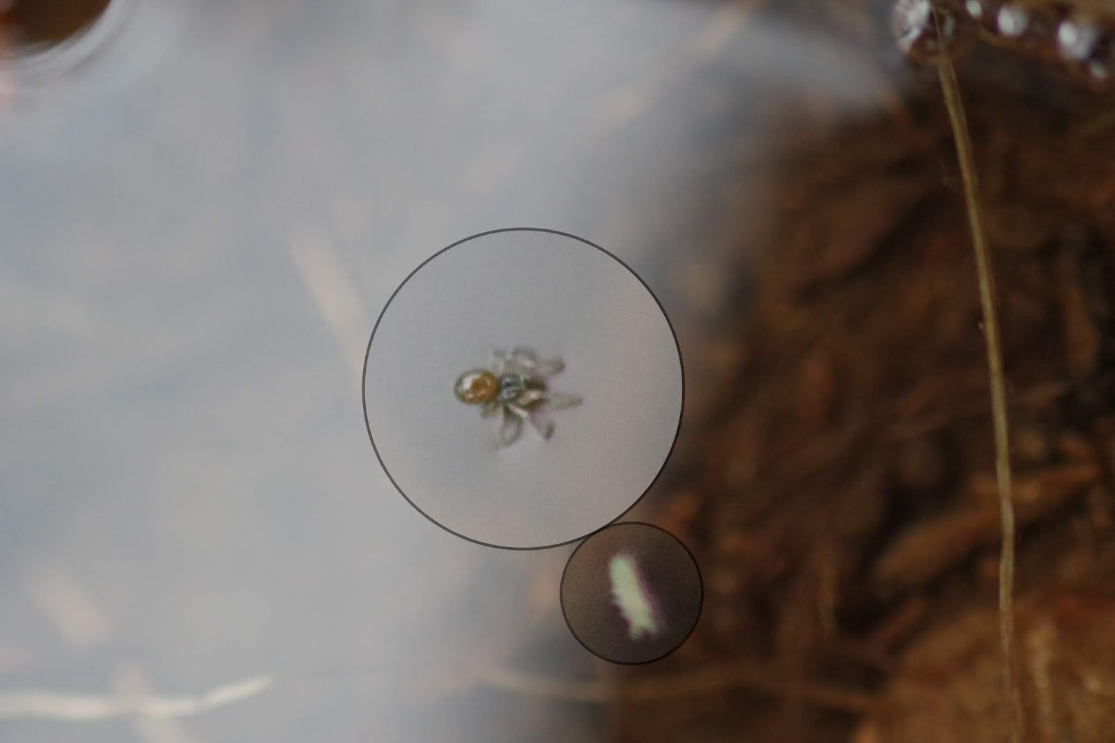 The springtail was not alone on the puddle. There was an incredibly tiny spider there, too. And I can't tell, but that white speck might be another kind of springtail?