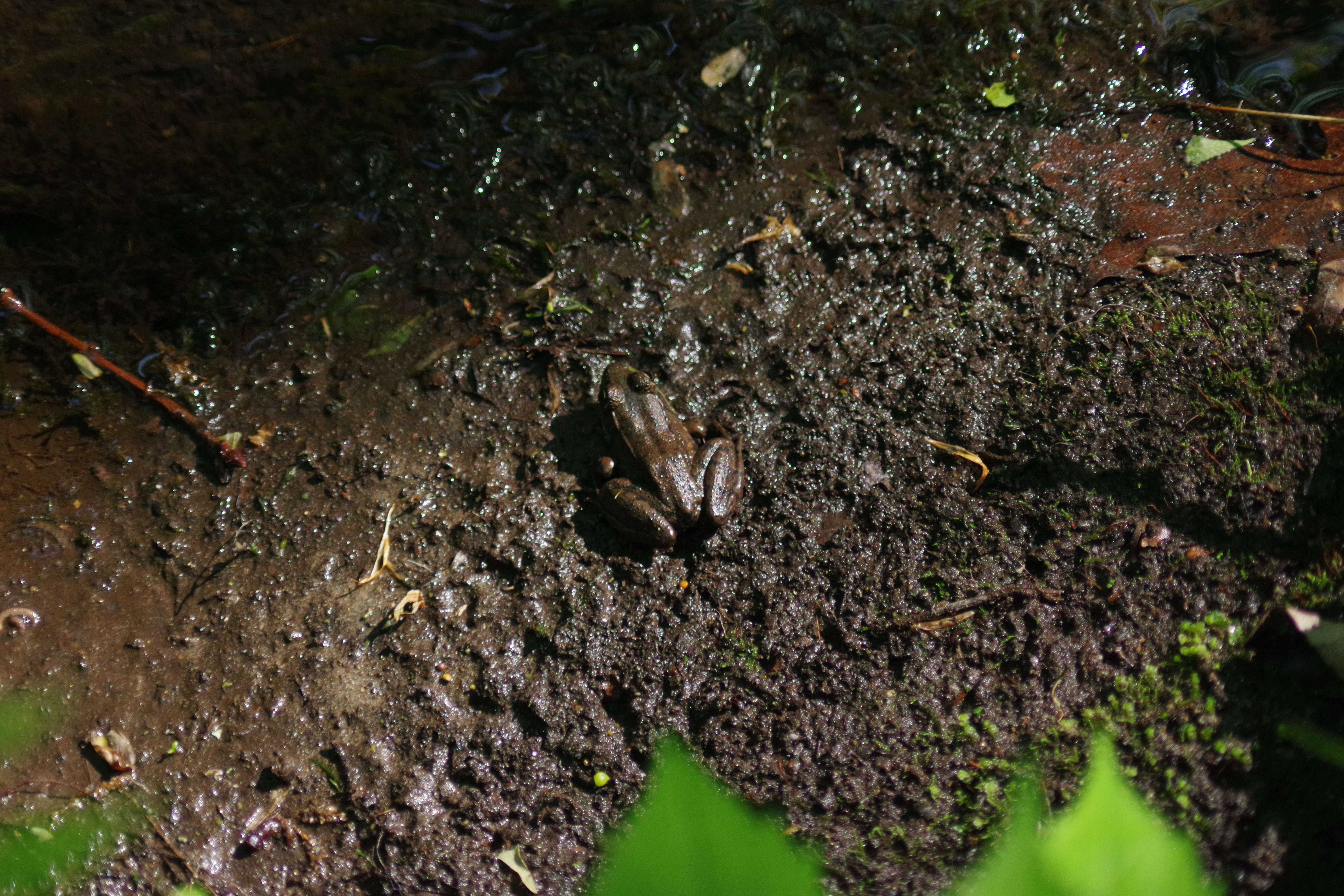 There's a spot by the stream–well, when there's a lot of rain this is IN the stream–where there is a hole that leads who-knows-where (the frogs know), and there are often frogs near this hole. If I get too close, the frogs disappear into the hole: